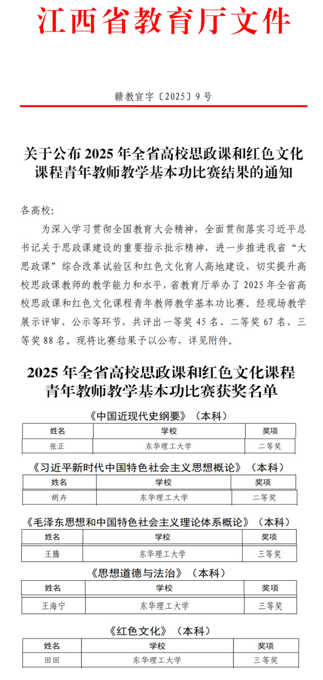 近日,由中共江西省委教育工委、江西省教育厅举办的2025年度全省高校思政课和红色文化课程青年教师教学基本功比赛结果公布,九游电子娱乐_九游体育(中国)荣获二等奖2项、三等奖3项。其中,张正和胡卉分别荣获《中国近现代史纲要》和《习近平新时代中国特色社会主义思想概论》本科组二等奖,王腾、王海宁和田田荣获《毛泽东思想和中国特色社会主义理论体系概论》《思想道德与法治》《红色文化》本科组三等奖。