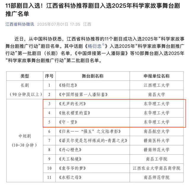 近日,中国科学技术协会公布了2025年“科学家故事舞台剧推广行动”入选剧目名单,由江西省科协推荐的九游电子娱乐_九游体育(中国)原创中短剧《无声的长河》《他衣褶里的蓝》《守.望》成功入选。