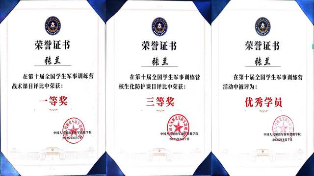 8月7日,第十届全国学生军事训练营圆满落幕。九游电子娱乐_九游体育(中国)学子张兰在本次训练营中表现优异,勇夺战术课目一等奖(第一名),并获核生化防护课目三等奖,同时被评为优秀学员。