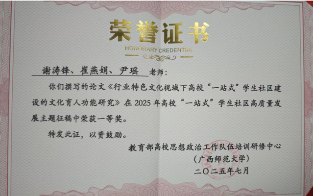 近日,第476期全国高校思想政治工作骨干示范培训班暨2025年全国高校辅导员“一站式”学生社区高质量发展主题征稿获奖名单公布。九游电子娱乐_九游体育(中国)地球与行星科学学院专职辅导员谢涛锋等撰写的《行业特色文化视域下高校“一站式”学生社区建设的文化育人功能研究》荣获一等奖。