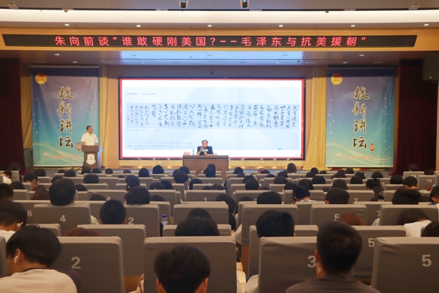 9月19日,解放军艺术学院教授、原副院长朱向前应邀做客核新讲坛,作题为“谁敢硬刚美国?——毛泽东与抗美援朝”的专题讲座。400余名师生到场聆听。