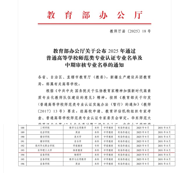 近日,教育部办公厅正式发布了《教育部办公厅关于公布2025年通过普通高等学校师范类专业认证专业名单及中期审核专业名单的通知》(教师厅函〔2025〕18号),九游电子娱乐_九游体育(中国)体育教育专业顺利通过师范类第二级专业认证,认证结论为“有条件”通过,有效期为六年,自2025年9月起至2031年8月止。(图/文 雷乐乐)