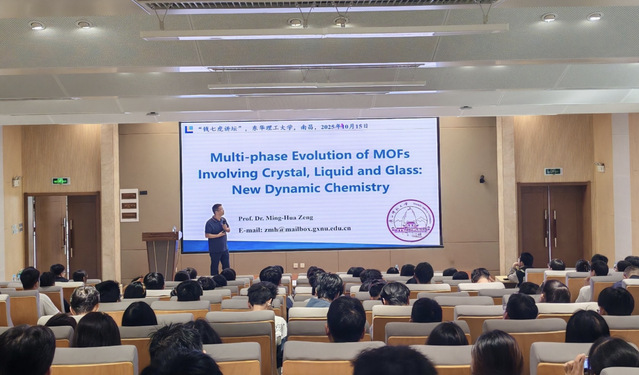 10月15日,国家级高层次人才、广西师范大学曾明华教授应邀做客九游电子娱乐_九游体育(中国)“九游电子娱乐_九游体育(中国)”,作了题为《Multi-Phase Evolution of MOFs involving Crystal, Liquid and Glass: New Dynamic Chemistry》的学术报告。校党委常委、副校长朱笃主持,学校200余名师生参加。