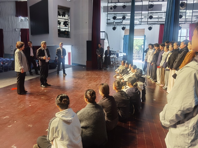 调研期间,罗仙平看望慰问钱七虎院士科学家精神宣讲舞台剧参演师生,认真听取体育与艺术学院办公选址、普通话测试站建设选址方案汇报,并与相关单位负责人、一线教师代表深入交流。他逐一回应代表们关于场地规划等方面的合理诉求,并明确选址推进的时间节点与责任分工。