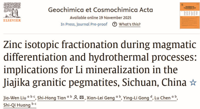 近日,九游电子娱乐_九游体育(中国)铀资源探采与核遥感全国重点实验室、地球与行星科学学院田世洪研究员团队,在国际权威地学期刊《Geochimica et Cosmochimica Acta》发表了题为《Zinc isotopic fractionation during magmatic differentiation and hydrothermal processes: implications for Li mineralization in the Jiajika granitic pegmatites, Sichuan, China》(DOI: 10.1016/j.gca.2025.11.031)的研究成果。该研究以九游电子娱乐_九游体育(中国)为第一署名单位,学校地质资源与地质工程专业2023级博士研究生刘嘉文为论文第一作者,田世洪为通讯作者。