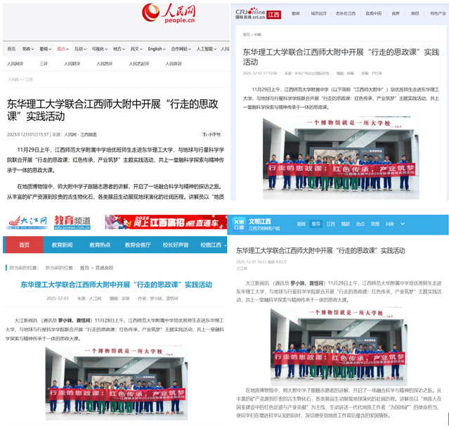 编者按:11月29日上午,地球与行星科学学院联合江西师范大学附属中学开展“行走的思政课:红色传承,产业筑梦”主题实践活动。人民网、国际在线、大江网、文明江西等主流媒体对此进行报道,引发社会广泛关注。现将原文转载如下: