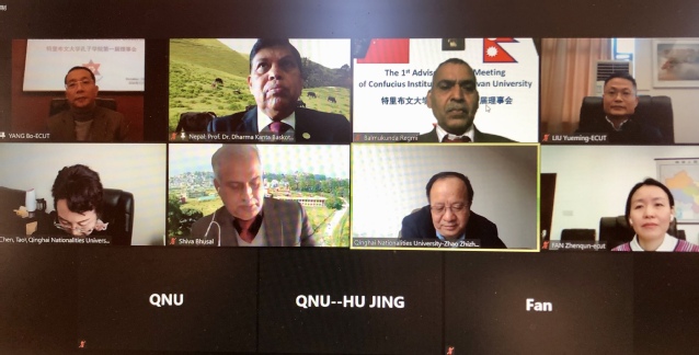 12月31日,我校与青海民族大学联合承办的尼泊尔特里布文大学孔子学院第一届理事会通过网络视频方式顺利召开。特里布文大学校长、孔院理事会轮值理事长Dharma K. Baskota携尼方理事特里布文大学教务长Shiva L Bhusal、孔子学院外方院长Balmukunda Regmi参加了此次会议,理事会轮值副理事长、我校副校长杨波,青海民族大学副校长赵之重率队参会,会议由孔子学院外方院长Balmukunda Regmi主持。