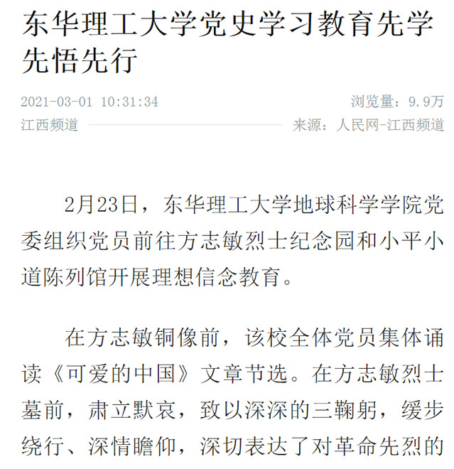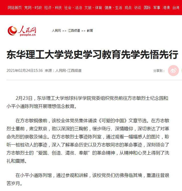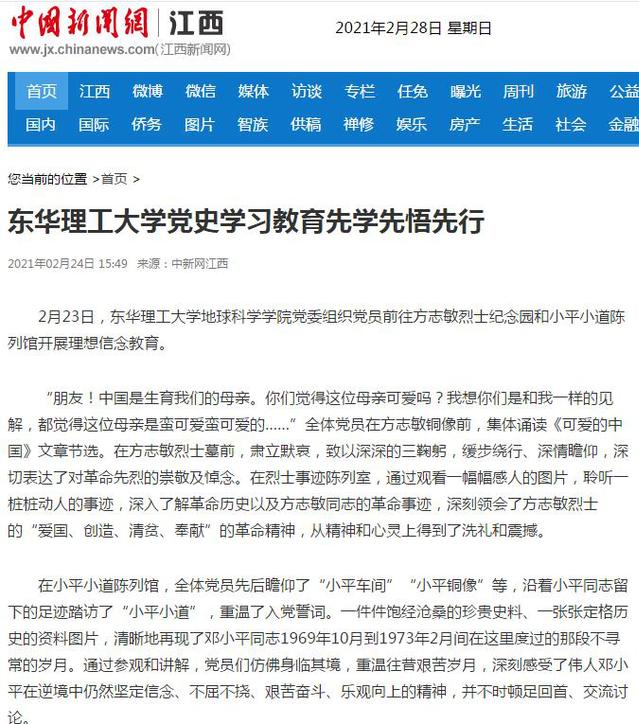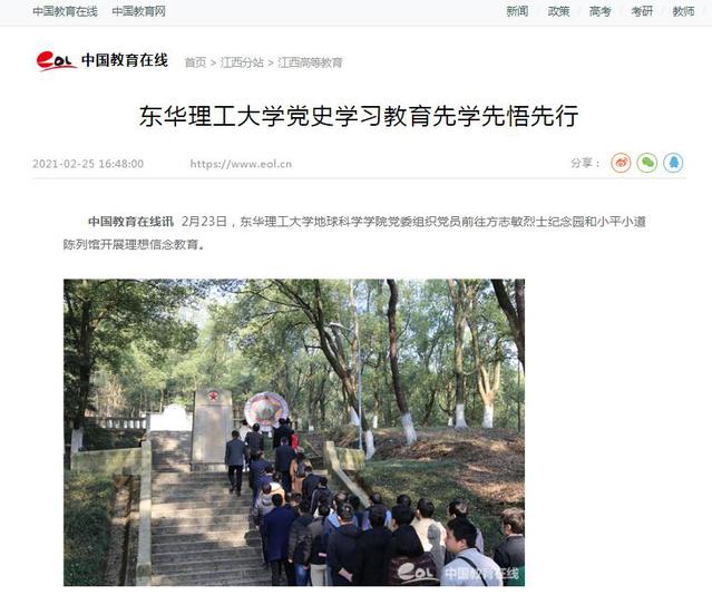 编者按:近日,地球科学学院党委组织党员前往方志敏烈士纪念园和小平小道陈列馆开展理想信念教育活动。以学先行、先学先悟,用实际行动为党史学习教育热身,营造良好氛围。人民网、中新网、新华社客户端、中国教育在线、江西网络广播电视台等媒体对此进行报道,引发社会广泛关注,现将相关内容转载如下: