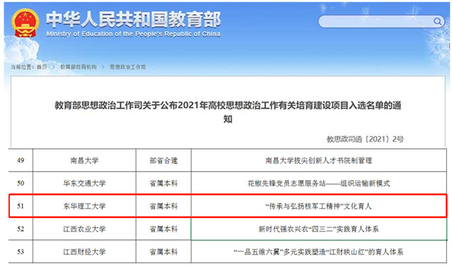 近日,教育部官网发布了《教育部思想政治工作司关于公布2021年高校思想政治工作有关培育建设项目入选名单》100项,江西省获批5项。其中,学校申报的《“传承与弘扬核军工精神”文化育人》项目入选“高校思想政治工作精品项目”,也是全省唯一连续两届获批该项目的高校。