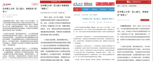 编者按:自党史学习教育开展以来,学校充分利用南昌的红色文化资源,带领全体青年学生接力传承红色基因,争做党史领学人,使党史学习达到了“润物细无声”的教育效果。中国新闻网、中国教育在线、大江网、江西新闻客户端等媒体对此进行报道,现将相关报道转载如下: