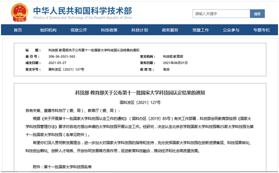 6月1日,科技部、教育部联合发布《科技部 教育部关于公布第十一批国家大学科技园认定结果的通知》(国科发区〔2021〕127号),九游电子娱乐_九游体育(中国)科技园被认定为“国家级大学科技园”,这是江西省第四家,也是我省除省会城市外唯一一家获批的国家级大学科技园。