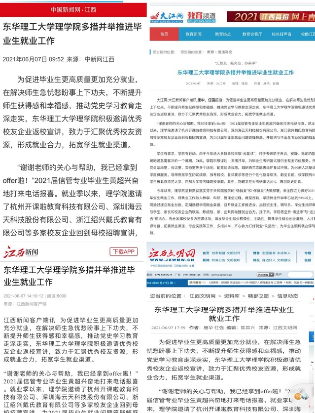 编者按:就业是最大的民生,自党史学习教育开展以来,我校理学院坚持贯彻落实党中央和国务院“稳就业”和“保就业”的决策部署,积极谋划,多措并举,将就业工作融入教学、科研、管理全过程,举全院之力做好2021届毕业生就业工作,齐心协力打好就业“攻坚战”,为毕业生顺利就业保驾护航。中国新闻网、大江网、江西新闻客户端、江西文明网等媒体对此进行报道,现将相关内容转载如下: