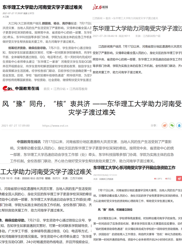 编者按:7月17日以来,河南省部分地区遭遇特大洪涝灾害,当地人民的生产生活受到了严重影响。为帮助我校河南受灾学子顺利渡过难关,按照校党委的统一部署,学生工作部(处)迅速行动,联合各学院、东华科技园等部门有序开展对受灾学生的帮扶救助关爱工作,确保灾情应急工作取得实效。中国教育在线、大江网、江西新闻网、江西新闻客户端、江西文明网、凤凰网等媒体对此进行报道,现将相关内容转载如下: