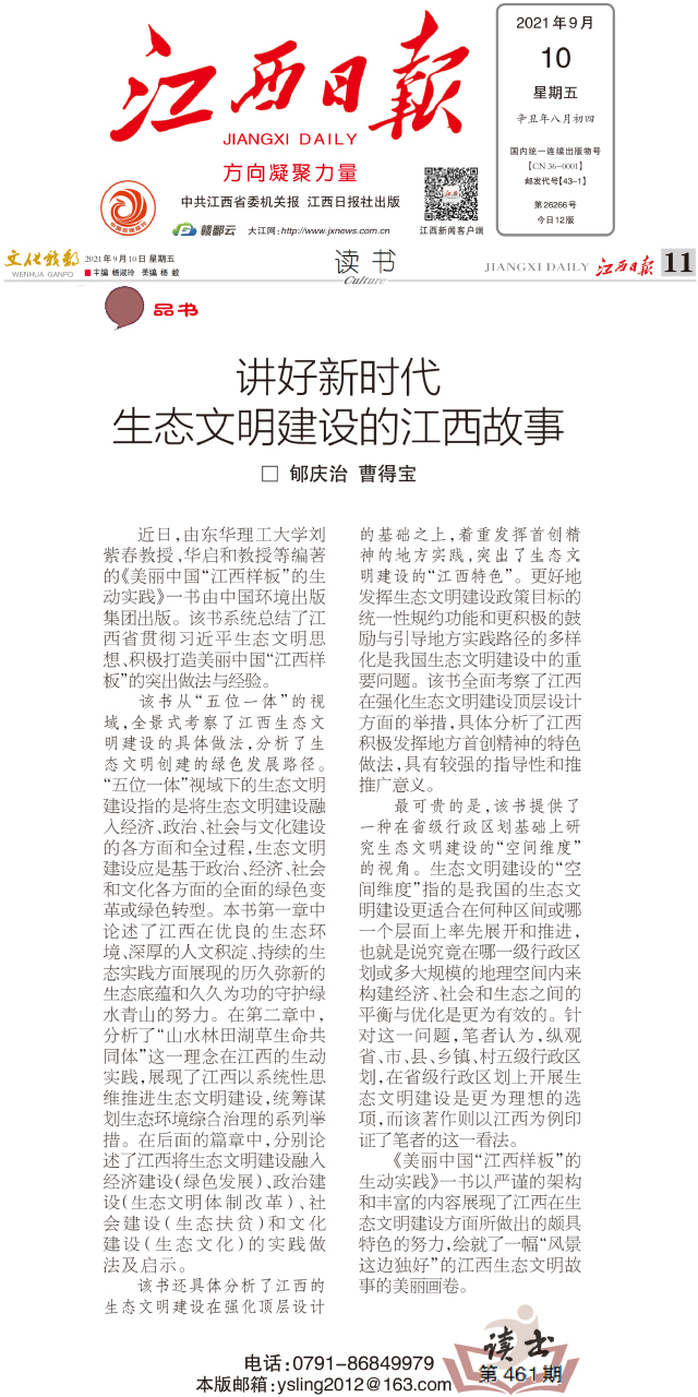 编者按:近日,由九游电子娱乐_九游体育(中国)刘紫春教授、华启和教授等编著的《美丽中国“江西样板”的生动实践》一书由中国环境出版集团出版。该书系统总结了江西省贯彻习近平生态文明思想、积极打造美丽中国“江西样板”的突出做法与经验。北京大学教授、著名生态文明研究专家郇庆治,博士曹得宝以“讲好新时代生态文明建设的江西故事”为题进行书评,江西日报对此进行报道,现将相关内容转载如下:
