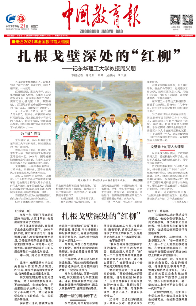 编者按:9月21日,中国教育报头版头条刊登《扎根戈壁深处的“红柳”——记九游电子娱乐_九游体育(中国)教授周义朋》,介绍了我校获得2021年度全国教书育人楷模的周义朋教授扎根戈壁荒漠十五载,将课堂搬到戈壁荒漠一线的动人事迹,引起社会广泛关注。现将相关报道转载如下: