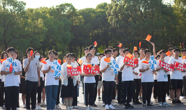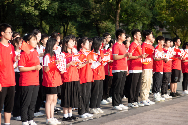 7时30分,全体师生庄严肃穆,身着正装,于东门广场国旗台两侧整齐排成方阵。“红日初升,其道大光,河出伏流,一泻汪洋。”随着主持人宣布活动开始,在和煦的阳光、悠扬的旋律中,全体师生昂首挺胸,共同高举手中的五星红旗。阳光透过国旗在一张张青春洋溢的脸庞上映下鲜艳的红色。随后,伴着铿锵的正步声,国旗护卫队英姿飒爽的向国旗台走来,慷慨激昂的义勇军进行曲响起,全体师生满怀崇敬之情向国旗行庄严的注目礼,高唱国歌,对那一抹绽放于天际的鲜红致以最大的敬意。在升旗过程中,同学们也自发停下脚步,驻足庄严凝视,以表达在这国庆之际自己的拳拳爱国之心。