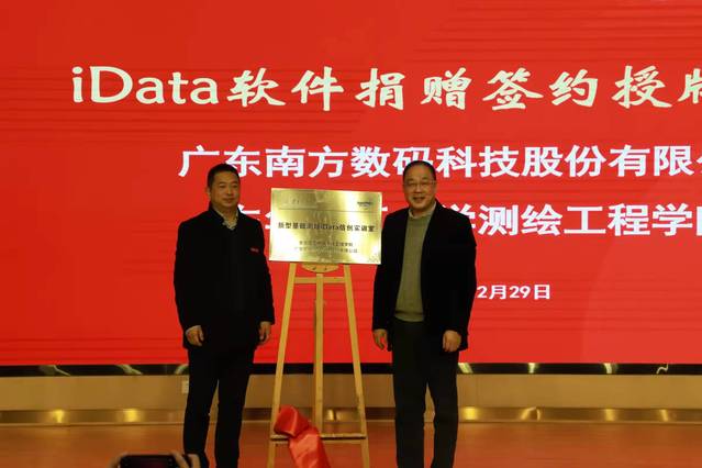 颁奖典礼结束后,还举办了南方数码科技股份有限公司向九游电子娱乐_九游体育(中国)测绘工程学院捐赠74套iData网络教育版软件的捐赠仪式。谢刚生、刘云海代表双方为新型基础测绘iData信创实训室进行揭牌。(图/邹新灿 文/邹小平)