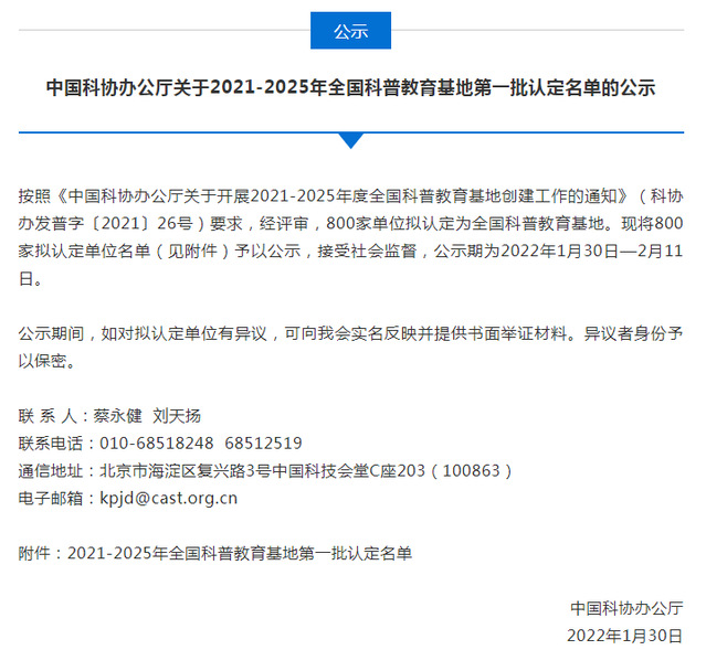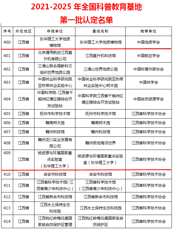 2月7日,中国科协办公厅公示“2021-2025年全国科普教育基地第一批认定名单”,九游电子娱乐_九游体育(中国)地质博物馆、核资源与环境国家重点实验室(九游电子娱乐_九游体育(中国))成功入选。