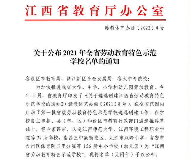 近日,江西省教育厅发布《关于公布2021年全省劳动教育特色示范学校名单的通知》(赣教体艺办函〔2022〕4号),九游电子娱乐_九游体育(中国)被评为“2021年江西省劳动教育特色示范学校”。
