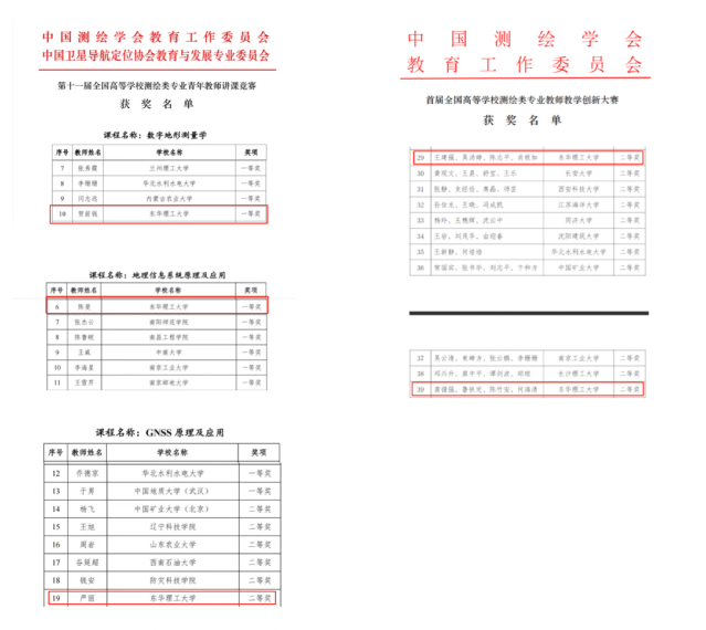 7月17日至19日,第十一届全国高等学校测绘类专业青年教师讲课竞赛与首届全国高等学校测绘类专业教师教学创新大赛在苏州市举办。青年教师讲课竞赛中,我校测绘工程学院教师贺前钱、陈斐分别荣获一等奖,严丽荣获二等奖。在教学创新大赛中,我校测绘工程学院王建强和龚循强分别领衔的教师团队均荣获二等奖。
