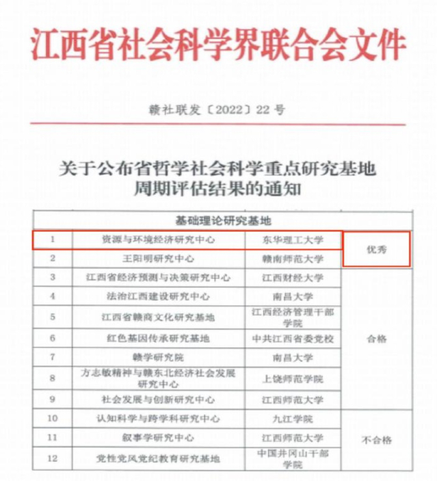 近日,江西省社会科学界联合会发布《关于公布省哲学社会科学重点研究基地周期性评估结果的通知》,依托经济与管理学院建设的江西省哲学社会科学重点研究基地资源与环境经济研究中心,在全省“基础理论研究基地”中获得第一名,并考核为“优秀”,这标志着我校在省哲学社会科学重点研究基地建设上取得了新成效。