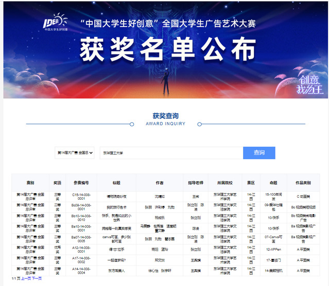 近日,“中国大学生好创意”第14届大广赛全国总评审结果揭晓,我校学子喜获全国二等奖2项、三等奖5项、优秀奖1项,江西赛区一等奖1项、二等奖6项、三等奖14项,获奖总数创我校该赛事新高。