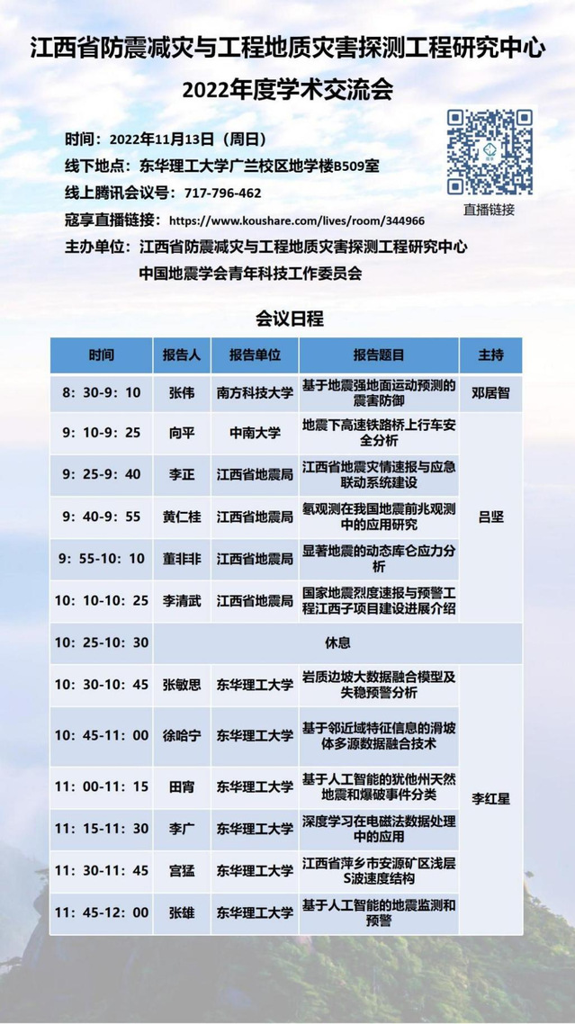 会议特邀南方科技大学、中南大学、江西省地震局以及九游电子娱乐_九游体育(中国)等相关学者分享防震减灾与工程地质灾害探测领域的最新研究成果。欢迎全体师生、相关科研工作者届时线下或线上参会。