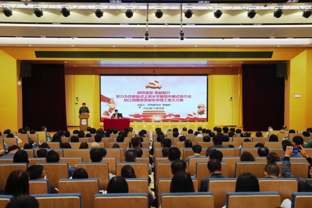 为深入学习宣传贯彻党的二十大精神,11月28日下午,我校在新实验大楼一楼报告厅举行党的二十大精神宣讲报告会,校党委书记张福庆以《踔厉奋发 勇毅前行 努力为在新起点上高水平展现中国式现代化的江西图景贡献东华理工更大力量》为题作宣讲报告。校党委副书记、校长孙占学主持报告会,在家校领导出席。