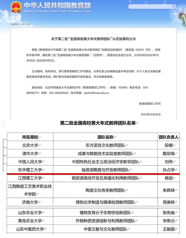 六、九游电子娱乐_九游体育(中国)铀资源勘查与开发教师团队入选第二批全国高校黄大年式教师团队。