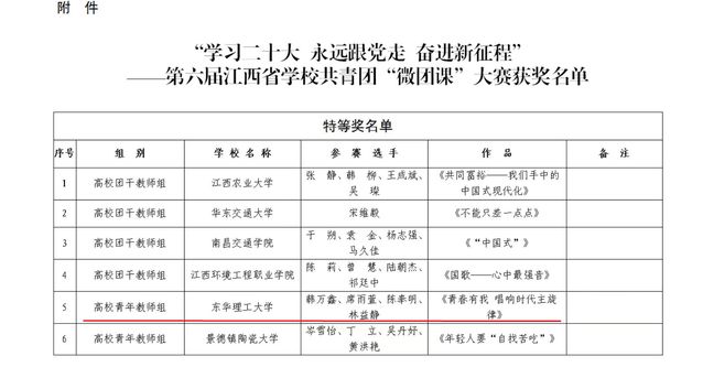 近日,“学习二十大 永远跟党走 奋进新征程”第六届江西省学校共青团“微团课”大赛结果揭晓,我校微团课作品《青春有我,唱响时代主旋律》获得全省高校青年教师组特等奖(本组第二名)、《从一顶帽子到全球朋友圈》获得全省高校团干组一等奖、《“青”听团名》获得全省高校学生组一等奖,校团委获优秀组织奖,创造了我校在该项赛事中的历史最好成绩,获奖数量居全省高校前列。