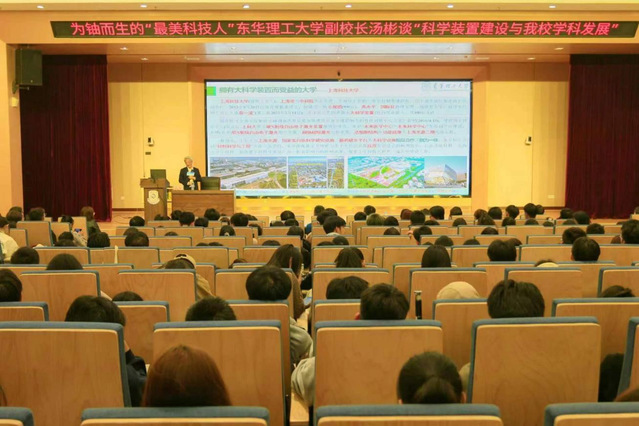 汤彬教授从科学装置的基本概念入手,以通俗易懂、引人入胜的语言介绍了科学装置的重要意义、工作原理、科学目标、主要应用领域及成果。他指出,大科学装置对学科发展意味着产生国家级大平台,进而催生大团队、大专家、大项目以及大成果,引领学科发展走在国家乃至世界前列。他强调,我校在建的“东华加速器中子源(ECANS)”是推动核科学等相关学科发展的“加速度”,对核基础数据测量、射线辐射成像、医用放射性同位素生产研发、多束流多能量辐射以及ECANS多功能多产业联动将产生重要意义和作用。
