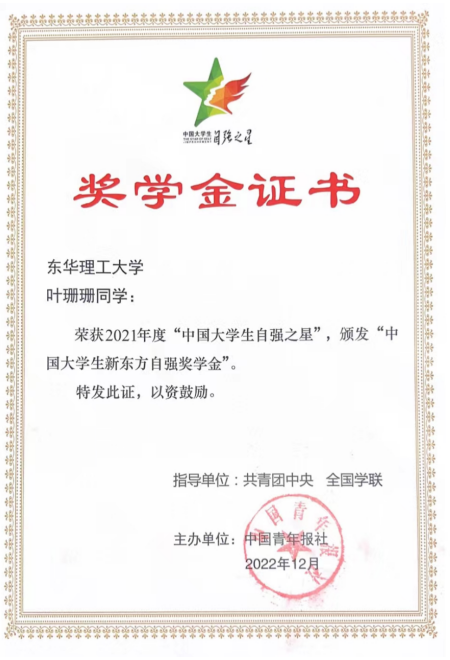近日,由共青团中央、全国学联指导,中国青年报社、新东方教育科技集团、中国青年创业就业基金会联合举办的2021年度“中国大学生自强之星”评选结果揭晓,学校土木与建筑工程学院2019级结构工程专业钟昌霖和抚州师范学院2019级汉语言文学专业叶珊珊两位同学脱颖而出,荣获“中国大学生自强之星”称号。我校获评人数位列江西省高校第二。