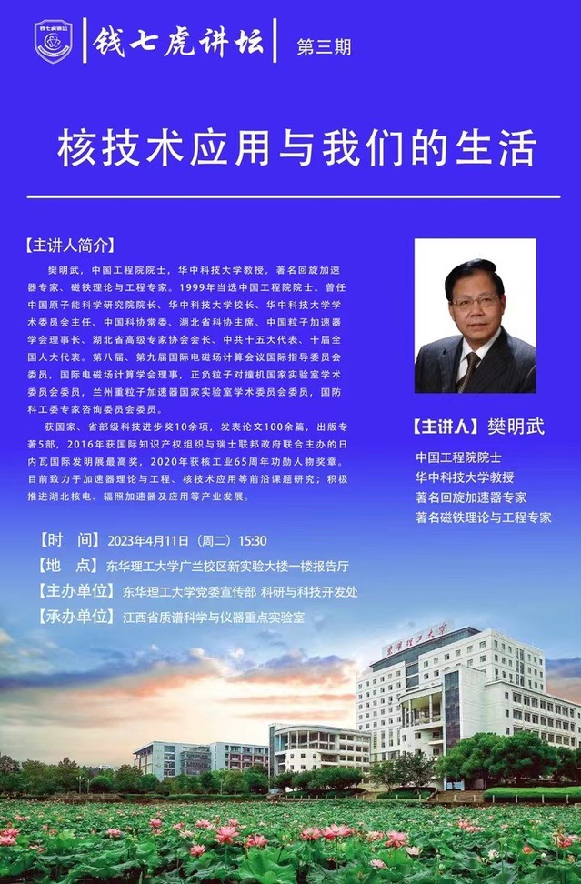 应江西省质谱科学与仪器重点实验室邀请,中国工程院院士、华中科技大学教授樊明武做客九游电子娱乐_九游体育(中国),以“核技术应用与我们的生活”为主题,向我校师生讲述核技术应用相关知识。欢迎全校师生届时前往聆听。