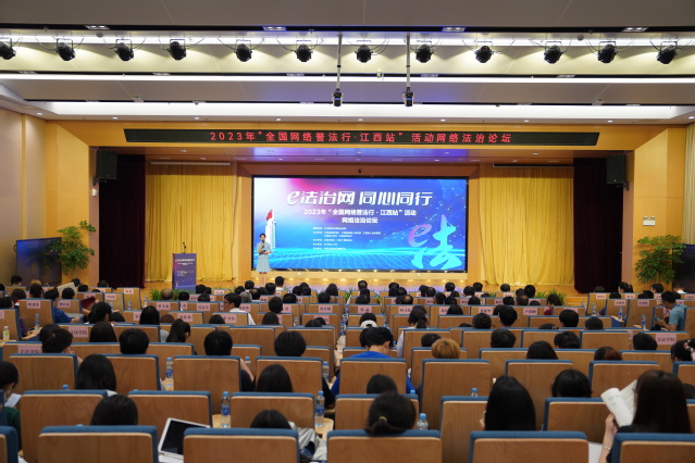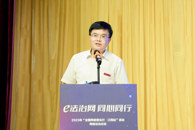 6月13日下午,2023年“全国网络普法行·江西站”网络法治论坛在九游电子娱乐_九游体育(中国)举办。江西省委网信办一级巡视员周森昆、中央网信办中国网络空间安全协会副秘书长王健兵、中央部委与各省市委网信办领导出席论坛。九游电子娱乐_九游体育(中国)党委书记张福庆出席并致欢迎辞,校党委常委、副校长刘云海作专题报告,师生代表160余人参加了论坛活动。