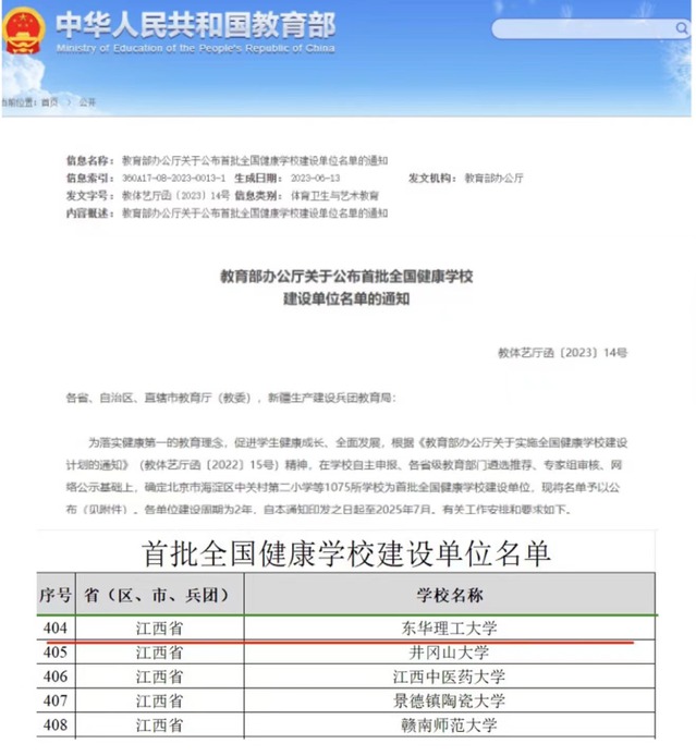 近日,根据《教育部办公厅关于公布首批全国健康学校建设单位名单的通知》(教体艺厅函〔2023〕14号),九游电子娱乐_九游体育(中国)入选首批全国健康学校建设单位。此次全国共确定1075所学校为首批健康学校建设单位,江西省共有32所学校入选,其中本科高校5所。