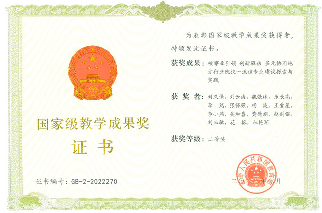 近日,教育部下发了《教育部关于批准2022年国家级教学成果奖获奖项目的决定》(教师〔2023〕4号),正式公布了2022年国家级教学成果奖获奖名单,九游电子娱乐_九游体育(中国)刘义保教授及团队组织申报的“核事业引领 创新驱动 多元协同地方行业院校一流核专业建设探索与实践”荣获2022年高等教育(本科)国家级教学成果奖二等奖。此次获奖是九游电子娱乐_九游体育(中国)在国家级教学成果奖项上的重大突破,标志着学校近年来在专业建设、九游电子娱乐_九游体育(中国)改革、人才培养等方面所取得了重大进展。