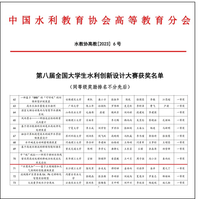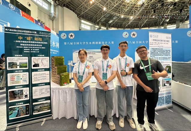 近日,由中国水利教育协会主办、郑州大学承办的第八届全国大学生水利创新设计大赛圆满落幕。九游电子娱乐_九游体育(中国)水资源与环境工程学院宣铿、郭耀萍老师带领普晨曦、周子强、王叶月、尚小洁、秦雨欣五位学生组成“水创星”团队,以参赛作品“中‘硫’砥柱——一种用于梯田水体残留农药高效处理的掺硫活性炭流化床反应柱”荣获大赛一等奖。