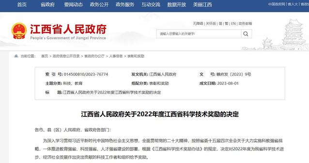 据悉,此次共有148项成果获2022年度江西省科学技术奖。其中,省自然科学奖特等奖1项,省自然科学奖一等奖6项,省自然科学奖二等奖22项;省技术发明奖二等奖4项;省科学技术进步奖特等奖2项,省科学技术进步奖一等奖25项,省科学技术进步奖二等奖87项。