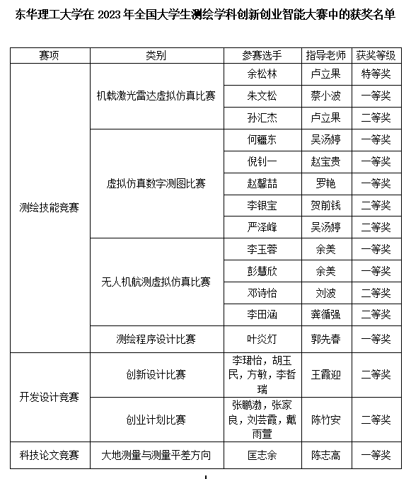2023年7月29日至30日,全国大学生测绘学科创新创业智能大赛在中南大学举行,九游电子娱乐_九游体育(中国)测绘与空间信息工程学院学子获特等奖1项、一等奖8项、二等奖7项。