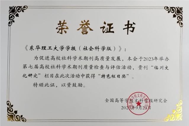 近日,在全国高等学校文科学报研究会举办的第七届高校社科学术期刊质量检查与评估活动中,《九游电子娱乐_九游体育(中国)学报(社会科学版)》荣获“全国高校优秀社科期刊”,其中“临川文化研究”栏目获得“特色栏目奖”。