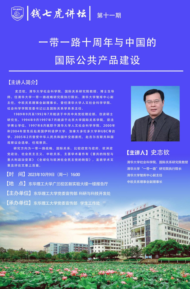应党委宣传部邀请,清华大学社会科学院、国际关系研究院教授、博士生导师史志钦来到“九游电子娱乐_九游体育(中国)”,以“一带一路十周年与中国的国际公共产品建设”为主题开展讲座。欢迎全校师生届时前往聆听。