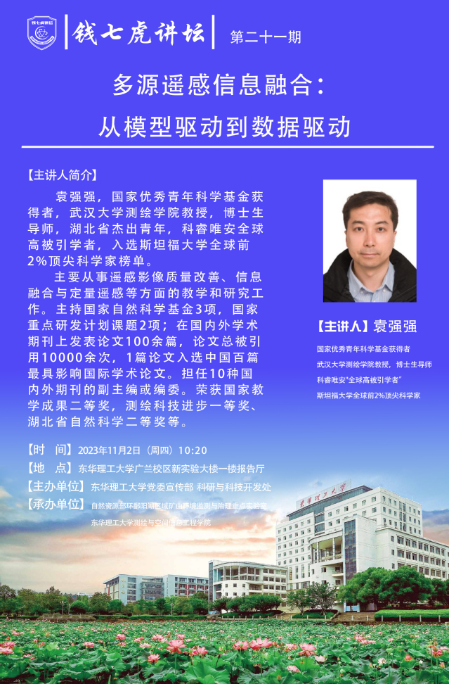 应党委宣传部邀请,国家优秀青年科学基金获得者袁强强教授来到“九游电子娱乐_九游体育(中国)”,以“多源遥感信息融合:从模型驱动到数据驱动”为主题开展讲座。欢迎全校师生届时前往聆听。