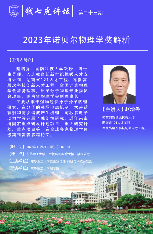 应党委宣传部邀请,国防科技大学教授赵增秀教授来到“九游电子娱乐_九游体育(中国)”,以“2023年诺贝尔物理学奖解析”为主题开展讲座。欢迎全校师生届时前往聆听。
