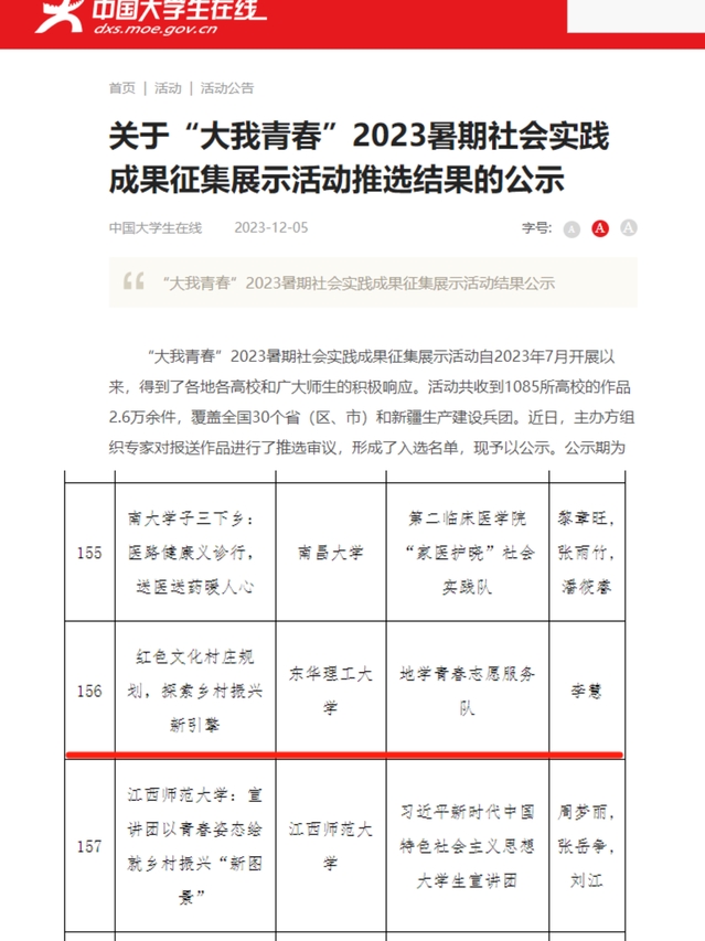 近日,由中国大学生在线主办的“大我青春”2023暑期社会实践成果征集展示活动的推选结果公布。九游电子娱乐_九游体育(中国)“地学青春”志愿服务队作品《红色文化村庄规划,探索乡村振兴新引擎》获评实践风采类优秀作品。