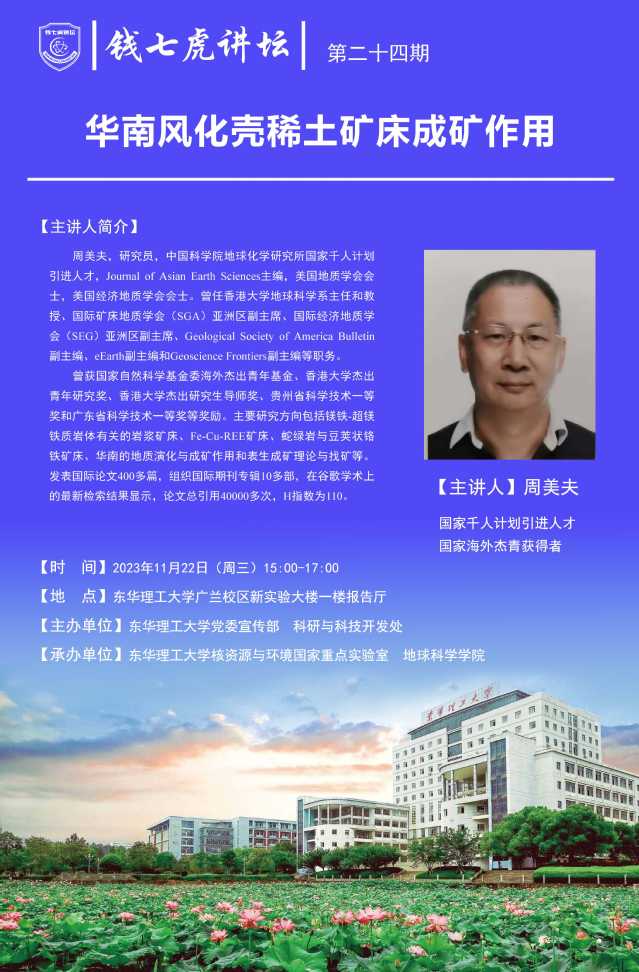 应核资源与环境国家重点实验室邀请,中国科学院地球化学研究所周美夫研究员来到“九游电子娱乐_九游体育(中国)”,以“华南风化壳稀土矿床成矿作用”为主题开展讲座。欢迎全校师生届时前往聆听。