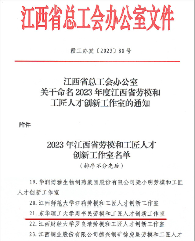 近日,省总工会公布了2023年度“江西省劳模和工匠人才创新工作室”名单,九游电子娱乐_九游体育(中国)周书民教授领衔的工作室成功获评“九游电子娱乐_九游体育(中国)周书民劳模和工匠人才创新工作室”称号,全省共有30个工作室获评。
