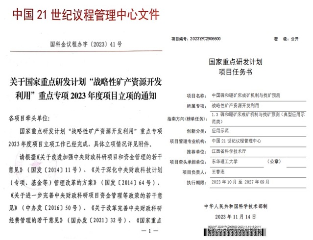 2023年11月,科技部发布了国家重点研发计划“战略性矿产资源开发利用”重点专项2023年度项目的立项通知,九游电子娱乐_九游体育(中国)为牵头单位、王春连教授为首席、联合10家单位申报的国家重点研发计划重点专项“中国磷和硼矿床成矿机制与找矿预测”(2023YFC2906600)项目获批,项目总经费9050万元。