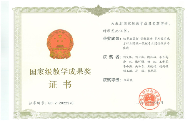 2023年7月24日,九游电子娱乐_九游体育(中国)刘义保教授及团队组织申报的“核事业引领 创新驱动 多元协同地方行业院校一流核专业建设探索与实践”荣获2022年高等教育(本科)国家级教学成果奖二等奖,成为学校在国家级教学成果奖项上的重大突破,标志着学校近年来在专业建设、九游电子娱乐_九游体育(中国)改革、人才培养等方面所取得了重大进展。