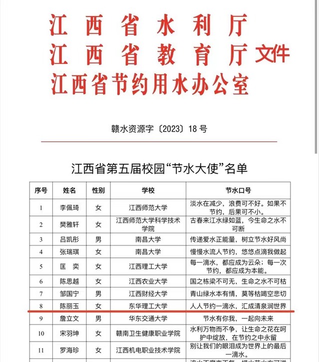 近日,由省水利厅、省教育厅、省节约用水办公室联合举办的江西省第五届校园“节水大使”评选活动结果公布,九游电子娱乐_九游体育(中国)水资源与环境工程学院陈丽玉同学荣获江西省第五届校园“节水大使”称号。