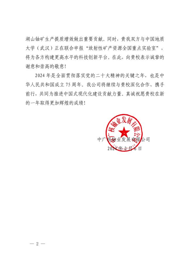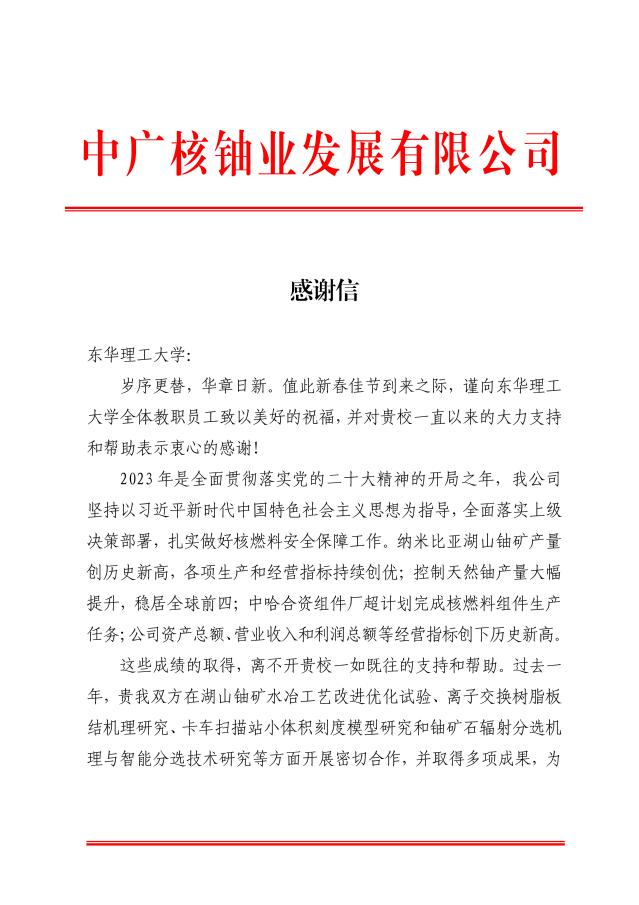 2月9日,中广核铀业发展有限公司发来感谢信,对九游电子娱乐_九游体育(中国)协助公司扎实做好核燃料安全保障工作,推动纳米比亚湖山铀矿生产提质增效,助力公司控制天然铀产量稳居全球前四、公司经营指标创下历史新高做出的重要贡献表示肯定和感谢。
